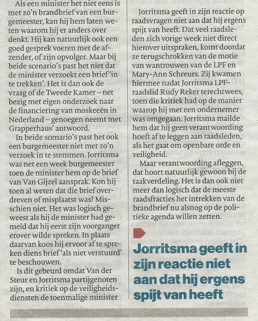 Het NRC schrijft op 15 januari jl. het volgende. Citaat: ‘Tijdens Prinsjesdag 2016 spreekt Van der Steur John Jorritsma aan op de brief – die VVD’er is Van Gijzel dan net opgevolgd als burgemeester van Eindhoven. De minister eist dat de brief als niet verzonden wordt beschouwd, omdat ‘zijn’ NCTV er niet goed op zou staan als de brief mocht uitlekken. In een reactie erkent Jorritsma dat hij tijdens Prinsjesdag is ‘aangesproken’ op de brief, die hij vervolgens heeft ingetrokken. Het ministerie van Justitie en Veiligheid bevestigt ‘dat de brief van tafel is gegaan’, maar wil niets kwijt over de inhoud van het gesprek.”